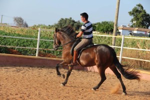 Er war seid Einreiten am Jahresanfang aussschliesslich 3-4 mal die Woche im Gelände, hat aktuell die grosse Feria in Vejer in vollen Zügen ganz cool mit gemacht mit seinem „Opa“ Reiter ..Ü 70….